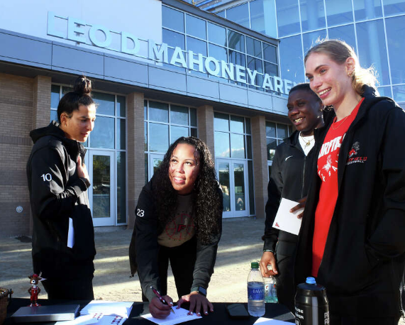 大學社區的成員周三聚集在一起,參加將于11月開放的新競技場的基石儀式。當天早些時候,大學校長馬克·內梅克宣布,該競技場將被命名為利奧·馬奧尼競技場。