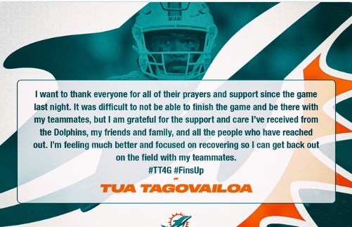 塔戈瓦伊洛亞本人在周五下午發表了一份聲明,并表示他感覺好多了,并專注于回到球場上。