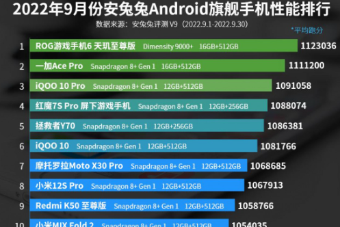 安兔兔9月份性能最佳手機排行榜已經公布,ROGPhone6DUltimate成為新的領導者,一加AcePro和iQOO10Pro等主要競爭對手分別位居第二和第三位。新的ROGPhone6DUltimate是列表中唯一一款沒有搭載高通驍龍8+Gen1芯片組,而是依靠Dimensity9000+SoC的智能手機,獲得了1,123,036分。這里的總分是CPU、GPU、內存和UI組件的總和。