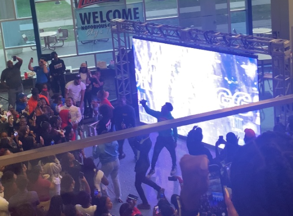 馬丁路德金中心從前到后擠滿了渴望了解誰將在今年的返校節活動中表演的人。每個人都試圖在一樓和二樓尋找一個空間,以便看到正在宣布表演者的屏幕。有一個技術問題,將公告延遲了將近三十五分鐘,但大家都留下來耐心等待返校信息的發布。