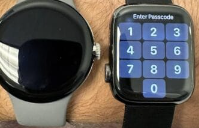 我們已經(jīng)提前看到了PixelWatch的拆箱,所以我們有機(jī)會(huì)查看它的真實(shí)圖像。好吧,這組新圖像也出現(xiàn)在Reddit上,來(lái)源相同。除了一堆PixelWatch的照片,你還可以看到它與AppleWatch的對(duì)比。兩者都并排擺在一個(gè)人的手上,如下圖所示。