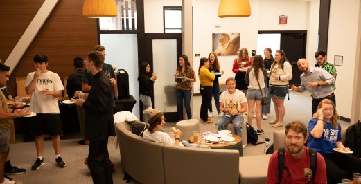 30 多名學生聚集在健康中心享用比薩晚餐,并由大學部的四位學生領袖發表演講,他們都在暑假期間與其他天主教年輕人一起開始了以服務為導向的全球旅行。