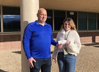 圖為杰瑞將支票交給凱莉。這筆捐款將用于資助去年購買的新合唱殼。韋斯特菲爾德地區合唱團和戲劇系感謝您的慷慨。