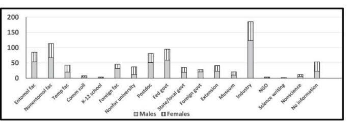 在2001年至2018年獲得博士學(xué)位的昆蟲學(xué)家中,截至2021年,擔(dān)任技術(shù)代表和研究科學(xué)家的行業(yè)職位的男性明顯多于女性。在各個(gè)工作類別中,女性在非大學(xué)職位上的速度僅次于男性。與此同時(shí),男性在研究生課程中發(fā)表的研究文章明顯多于女性,然后繼續(xù)獲得更高的出版量和影響力。