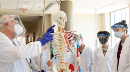 健康科學與技術學院通過新的精簡組織結構為發展做準備。在這里,醫學科學、健康和管理系主任詹姆斯·珀金斯在他的大體人體解剖課上與學生交談。