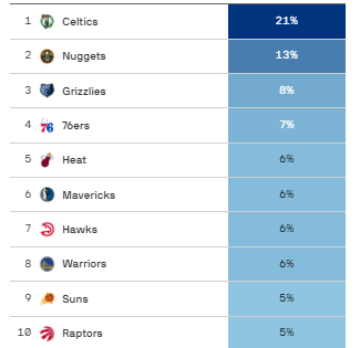 掘金隊(13%):賈馬爾·穆雷(ACL)回來了,尼古拉·約基奇正在爭奪成為第四位贏得三連冠(拉里·伯德、比爾·拉塞爾和威爾特·張伯倫)的球員。