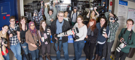 在佳能活動期間,弗蘭克·科斯特(中)被許多攝影學生包圍。他在 RIT 工作了 40 年后即將退休。