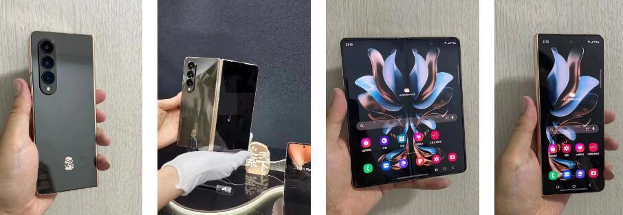 這些圖像顯示,銀河Z Fold 4的基礎(chǔ)設(shè)計(jì)沒(méi)有變化。配色方案也與去年的三星W22相同,帶有拋光的灰色背面,中間有一個(gè)寫(xiě)著“心向世界”的標(biāo)志,以及鍍金的邊緣和鉸鏈。其中一張圖片顯示了鍍金的背面,這可能是W23的變體。