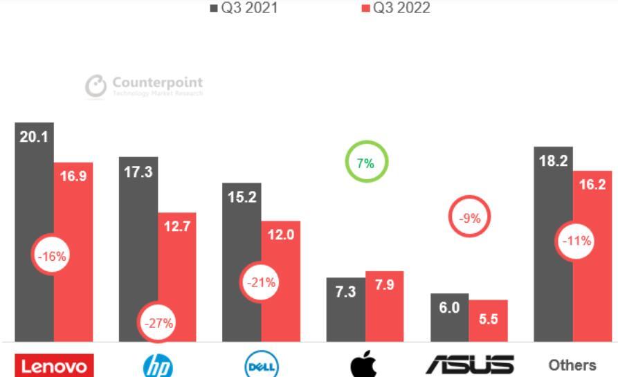 至于原始設備制造商,蘋果的出貨量同比增長7%。這是因為這家總部位于庫比蒂諾的巨頭在第二季度末宣布了一款新產品,并在中國封鎖后重新入庫。華碩的出貨量同比下降了9%,而聯想下降了16%。兩家公司在2022年第三季度的市場份額分別為5.5%和16.9%。惠普在第三季度售出了1270萬臺,占18%的份額。它同比下降了26.5%。戴爾的出貨量下降了17%,下降了20%。