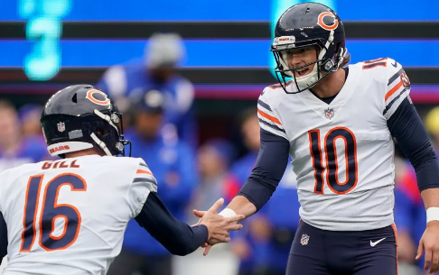 2022 年 10 月 2 日星期日,在新澤西州東盧瑟福,芝加哥熊隊踢球手邁克爾·巴德格利(10 歲)在與紐約巨人隊的 NFL 橄欖球比賽中射門得分后與芝加哥熊隊下注者特倫頓·吉爾一起慶祝(美聯社照片/約翰明奇略)