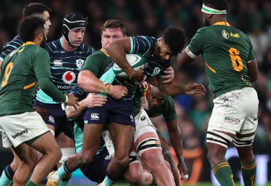 第 16 分鐘,Cheslin Kolbe 和 Pieter-Steph du Toit 聯合對愛爾蘭邊鋒 Mack Hansen 進行鏟球,科爾貝被認為是主要責任,但至少他得到的是黃牌而不是紅牌。