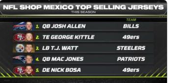 布法羅比爾隊四分衛(wèi)喬什艾倫的球衣在墨西哥最受歡迎,其次是基特爾、匹茲堡鋼人隊線衛(wèi) TJ 瓦特、新英格蘭愛國者隊四分衛(wèi)麥克瓊斯和博薩。