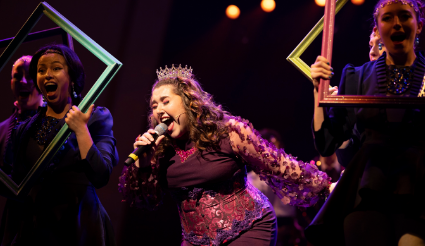 由音樂劇院導演小胡里奧·馬托斯 (Julio Matos Jr.) 執導的“Head Over Heels”是一個引人入勝的愛情故事,背景是 1980 年代全女性搖滾樂隊 The Go-Go's 的音樂,包括“We Got the Beat”等歌曲”、“我們的嘴唇是密封的”和“假期”。這部音樂劇改編自菲利普·西德尼爵士 (Sir Phillip Sidney) 的《世外桃源》(The Arcadia),是一場歡鬧、熱烈的愛情慶典。