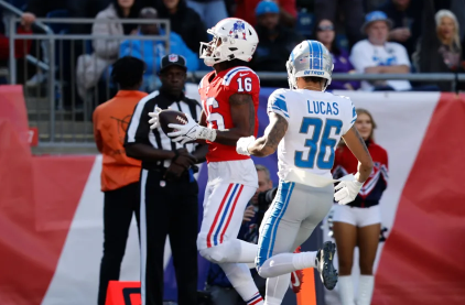 2022 年 10 月 9 日星期日,在馬薩諸塞州福克斯伯勒,愛國者隊的外接手 Jakobi Meyers(16 歲)跑到達陣區達陣,而獅子隊角衛 Chase Lucas(36 歲)試圖在下半場進行防守。