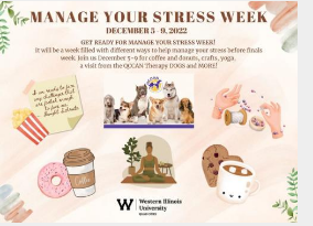 西伊利諾伊大學四城分校將于12 月 5 日至 8 日星期一至星期四舉辦一系列“管理壓力周”活動,這是 WIU-QC 的傳統活動,發生在期末考試前一周。WIU-QC 學生服務、學生自治協會和各種學生組織合作提供一系列輕松愉快的活動,以放松和支持學生、教職員工。
