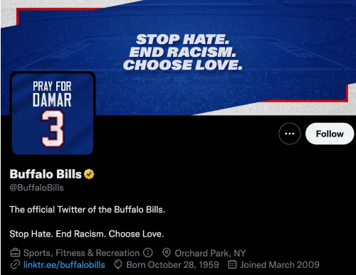 周二,所有 32 支球隊(duì)都將他們的 Twitter 圖標(biāo)更改為哈姆林的布法羅比爾隊(duì)球衣圖片以及標(biāo)題“為達(dá)馬爾祈禱”。隨著哈姆林狀態(tài)的消息傳出,球隊(duì)在周二下午做出了改變。在周一對(duì)陣辛辛那提猛虎隊(duì)的比賽中,比爾安全隊(duì)因心臟驟停而住院治療。在與孟加拉虎接球手Tee Higgins對(duì)決時(shí),他的胸部受到直接撞擊后倒在了球場(chǎng)上。醫(yī)護(hù)人員在現(xiàn)場(chǎng)重新啟動(dòng)了他的心跳,他被送往辛辛那提一家醫(yī)院,情況危急。