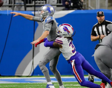 2022 年 11 月 24 日星期四,布法羅比爾隊(duì)的安全衛(wèi)達(dá)馬爾哈姆林(3 歲)在上半場在底特律福特球場迎戰(zhàn)底特律雄獅隊(duì)四分衛(wèi)賈里德高夫(16 歲)。