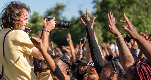 來(lái)自紐約州華盛頓維爾的四年級(jí)新聞攝影專業(yè)學(xué)生文森特·阿爾班(中)被評(píng)為2022 年度大學(xué)攝影師。