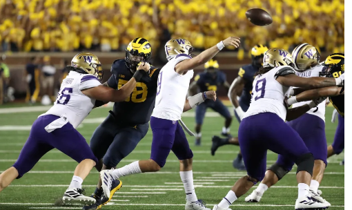 2021 年 9 月 11 日星期六,在密歇根體育場以 31-10 戰勝華盛頓的比賽中,密歇根防守邊鋒馬茲史密斯沖向華盛頓四分衛迪倫莫里斯。