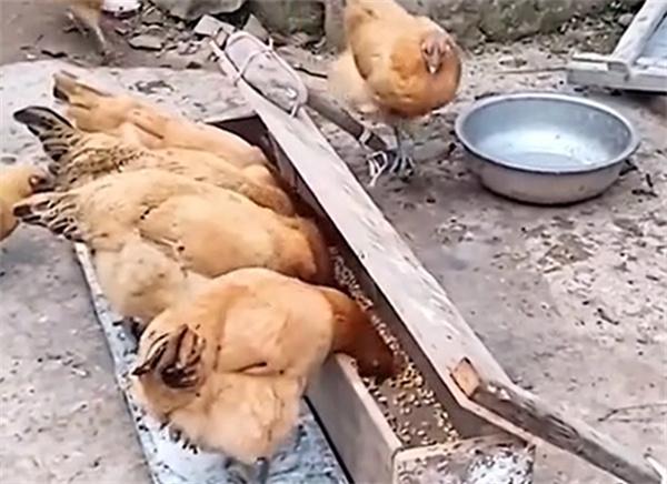 該男子做的這個(gè)喂雞神器非常的簡(jiǎn)易,就是簡(jiǎn)簡(jiǎn)單單用一個(gè)木頭槽,然后上面有一個(gè)可以活動(dòng)的蓋子,蓋子的兩邊有木棍,木棍被男子用繩子綁成了筷子狀的構(gòu)架,夏方又安裝了一個(gè)可以活動(dòng)的木板,然后這根棍子又延伸到了木板底下,等幾只雞在吃食的時(shí)候就會(huì)踩在木板上,然后喂食神器的蓋子就會(huì)被打開。