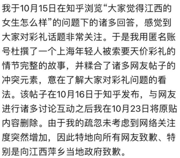 之后澎湃新聞的記者發(fā)現(xiàn),在1月12日晚上,這的發(fā)布,1,888萬(wàn)彩禮文章的下邊,又有人發(fā)表了致歉聲明,關(guān)于這個(gè)天價(jià)彩禮的文章,是在支付平臺(tái)上發(fā)布的,用戶選擇的是匿名發(fā)布,當(dāng)時(shí)在知乎上的原話題是“大家覺(jué)得江西女生怎么樣”,其實(shí)大家都知道,現(xiàn)在很多地區(qū)的彩禮都非常高,液體的彩禮被稱為天價(jià)彩禮,也有很多人對(duì)這種彩禮的話題表示感興趣,這位網(wǎng)友覺(jué)得大家非常關(guān)注彩禮的話題,就杜撰了一個(gè)上海年輕人被江西女生所有天價(jià)彩禮的故事。