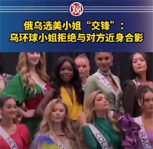 視頻中顯示烏克蘭的環球小姐阿帕納先科,再到了比賽合影的環節時,表示拒絕站在俄羅斯環球小姐林尼克娃的身旁,當時兩個人站的距離是比較近的,所以烏克蘭的環球小姐,阿帕納先科就和身旁的哥倫比亞小姐相互調換了位置,并拒絕和俄羅斯參賽的環球小姐近身合影,在換位之后,這兩位俄烏環球小姐中間隔了兩個人的位置。