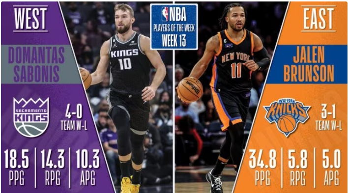 薩克拉門托國王隊前鋒中鋒多曼塔斯薩博尼斯和紐約尼克斯隊后衛賈倫布倫森被評為第 13 周的 NBA 本周最佳球員。