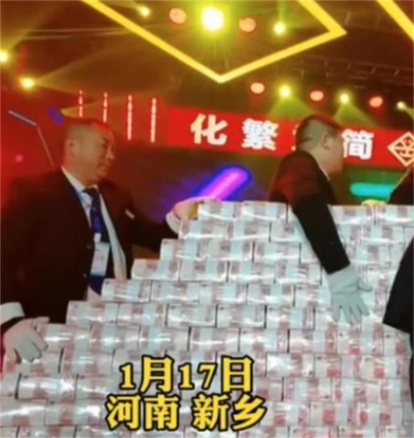 據九派新聞,最新報道稱,在1月17日,河南一家企業的年會上企業負責人向員工現場發放獎金,舞臺兩側的獎金堆成錢山,員工成本領取現金獎金,據了解獎金的數額超過了6,100萬,根據網上所傳的視頻中能看到,員工是存款領取獎金的,有一名員工摟著一大捆現金由于太多,有一捆掉在了地上。
