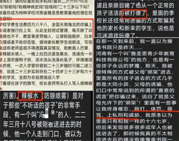 多名網絡用戶在微博和知乎等這些主流平臺上舉報稱,中牟縣的河南省雅圣思素質教育基地打折教育孩子的旗號,專門打罵和體罰學生,戒指磨練意志的借口,長期對學生進行虐待,辱罵和體罰,這里的教官拿著皮帶抽人,還讓學生們背著輪胎跑步,甚至有些學生被噴辣椒水,扇巴掌等,這家教育基地宣傳時表示專門治早戀和打架等學生,對于該學校的這種作為當地教育局表示不歸自己管。
