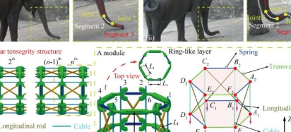由Wu和他的同事創(chuàng)造的象鼻啟發(fā)機(jī)器人基于3級張拉整體結(jié)構(gòu),該結(jié)構(gòu)由多個彈性元件組成,這些彈性元件均勻分布在整個結(jié)構(gòu)中。這使研究人員能夠簡單地通過用具有不同剛度大小的其他彈性元件替換彈性元件來對機(jī)器人的局部剛度特性進(jìn)行編程。