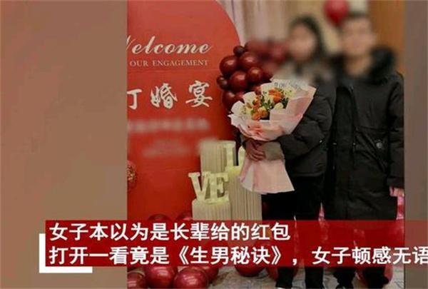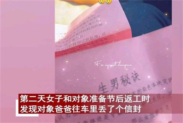 發(fā)布視頻的這位姜女士來自廣西玉林,河南有兩人在今年過年回家訂了婚,等過完年以后兩人準(zhǔn)備去廣東深圳打工,就在兩人臨行前,未來的準(zhǔn)公公在車中丟了一個(gè)信封,姜女士當(dāng)時(shí)心里還暗暗竊喜,以為是未來的準(zhǔn)公公送給自己的驚喜,之后姜女士非常高興的將這個(gè)信封打開了,誰(shuí)知道里面竟然是一張生男秘籍,頓時(shí)感到非常的無語(yǔ)。