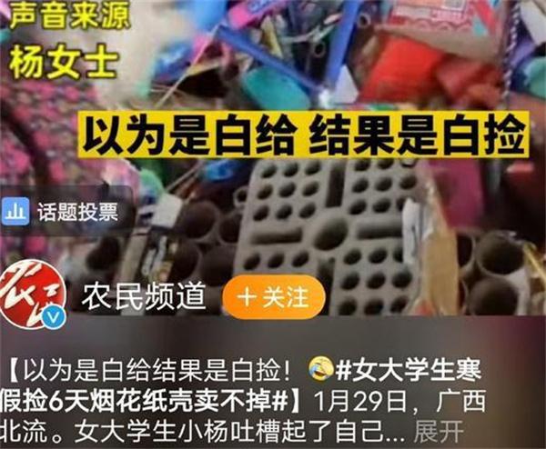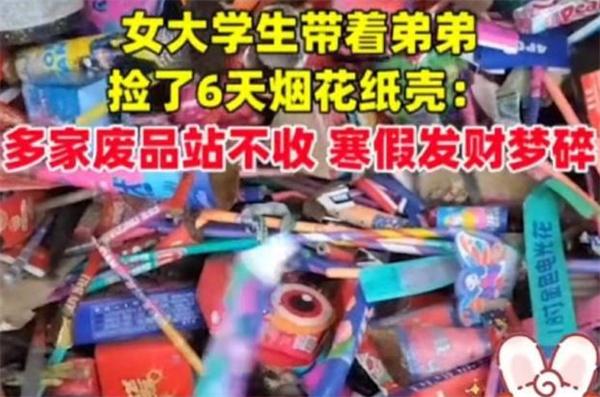 在1月29日一位來自廣西的女大學生在互聯網上吐槽,自己在寒假期間撿了6天的煙花紙殼子賣不掉,本想趁著寒假的期間勤工儉的女大學生小楊,趁著過年這幾天,帶著弟弟騎著家里的電驢,兩個人整整剪了6天的煙花紙殼子,誰知道廢品站都不收,最后只找到一家肯瘦的,還只要了五六斤,最終算下來兩個人剪了6天的紙殼子,只賣了兩元錢,小楊無奈的自嘲,發財夢碎了一地。