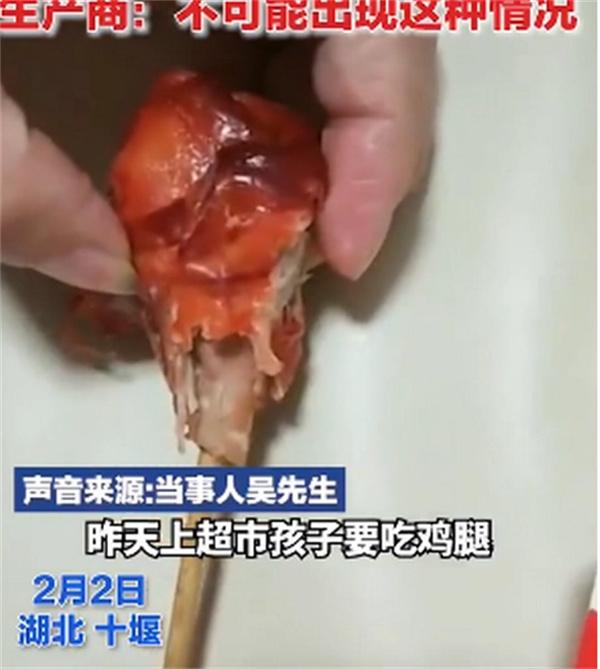 導(dǎo)讀 在2月2日,來自湖北十堰的吳先生在網(wǎng)絡(luò)上曝光稱自己在超市中給孩子買的雞腿的骨頭中插著木棍