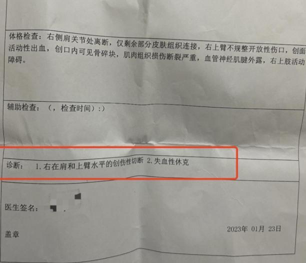 孩子被送往醫院以后因又被受傷過于嚴重,最終只能截肢,根據1月23日上饒市人民醫院出具的診斷證明中顯示,當時翁源的右側肩關節處離斷,僅剩部分皮膚組織連接,右上臂不規則開放性傷口創面有活動性出血,那件骨碎塊,血管,神經,肌腱,露出肌肉組織嚴重損傷。