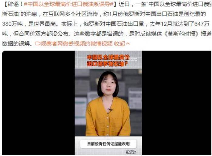 近日在多個互聯網社區流傳了一則關于“中國以全球最高價進口俄石油”的信息,在此信息中還說,在2023年1月份,中國購入的俄羅斯的石油高達380萬噸,已經創下了最新紀錄,是世界最高記錄,對這個消息,在2月8日,共青團中央通過官方微博賬號公布了辟謠信息。