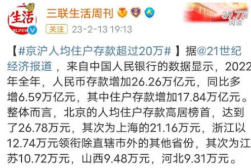根據數據資料顯示在2023年1月居民存款的新增規模創下了單月最新高,出現了超額儲蓄的現象,這種現象立即引發了社會各界的關注,其實在2022年的時候超額儲蓄就已經開始明顯,有消息披露,目前京滬人均住戶存款已超過20萬,這個消息一經披露,就立即登上了熱搜榜,在此次披露的2022年住戶存款數據的有20個省份中,北京人均住戶存款居首。