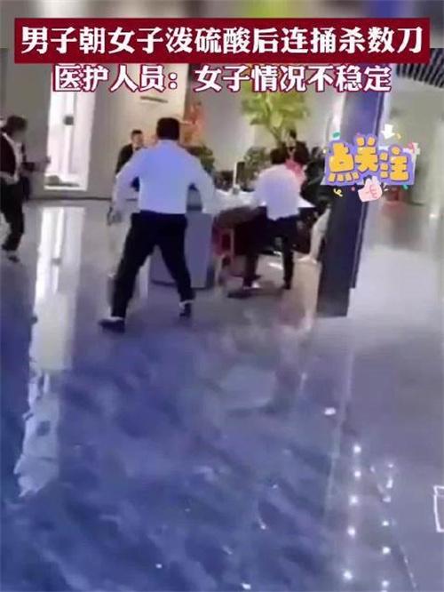 根據網絡上所流傳的視頻畫面可以看出,當時一名男子沖入瓷磚店內像一名女子猛潑硫酸之后,又連續地向女子捅刀捅了數刀,兩名工作人員試圖采用不同的方式阻止該男子,但是都沒有起到作用,場面非常混亂,幸虧現場的一名保安人,發現該情況后,使用防爆叉把這名男子按在了地上,將其制服,并等待警察到來。據知情人士表示,這名男子當時非常偏激,了硫酸之后又連續捅刀在女子的前面捅了三刀,后面又捅三刀。佛山市120將該女子送到了佛山市第五人民醫院治療。
