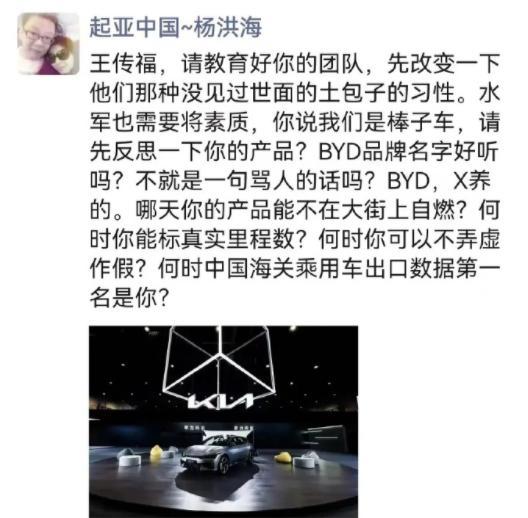 2月16日,起亞中國首席運(yùn)營官楊洪海發(fā)文“開撕”比亞迪,直接以6個(gè)反問直懟比亞迪的董事長王傳福。其實(shí)在汽車圈內(nèi)發(fā)生“互懟”的事情是很常見的,但更多的還是在技術(shù)方面,類似楊洪海這種激烈言語的可謂大開眼界,不少網(wǎng)友也開始評(píng)論,爭得耳紅面赤。