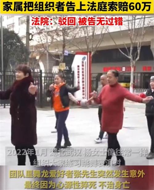 導讀 湖北武漢市的楊女士,于2022年1月組織大家練習跳舞表演,團里的舞龍愛好者,張先生發生意外,由于心源性猝死,不治身亡。半月之后張先生的家屬,將楊女士告上法庭,要求其賠償喪葬費以及死亡賠償金等相關費用60萬元,這一訴訟被法院駁回。