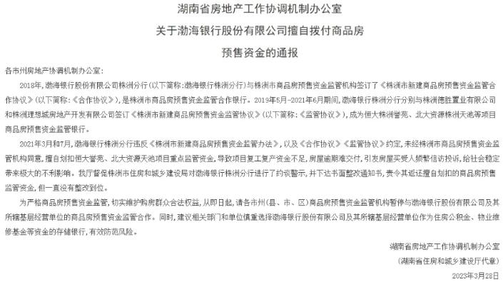 針對(duì)此事,湖南省住建廳已對(duì)渤海銀行株洲分行進(jìn)行了約談警示,并下達(dá)書面整改通知書,責(zé)令其返還擅自劃扣的商品房預(yù)售監(jiān)管資金。渤海銀行長(zhǎng)沙分行相關(guān)工作人員表示正在核實(shí)此事,并與當(dāng)?shù)卣块T進(jìn)行溝通。另?yè)?jù)界面新聞報(bào)道,渤海銀行長(zhǎng)沙分行工作人員回復(fù)稱,通報(bào)涉及的是恒大地產(chǎn)的對(duì)公項(xiàng)目,他們?cè)诓澈cy行有資金監(jiān)管賬戶,為了保證項(xiàng)目,渤海銀行株洲分行對(duì)監(jiān)管賬戶資金進(jìn)行了挪用,但沒(méi)有及時(shí)歸還,目前已經(jīng)在著手解決。對(duì)個(gè)人按揭貸款用戶不會(huì)造成影響。