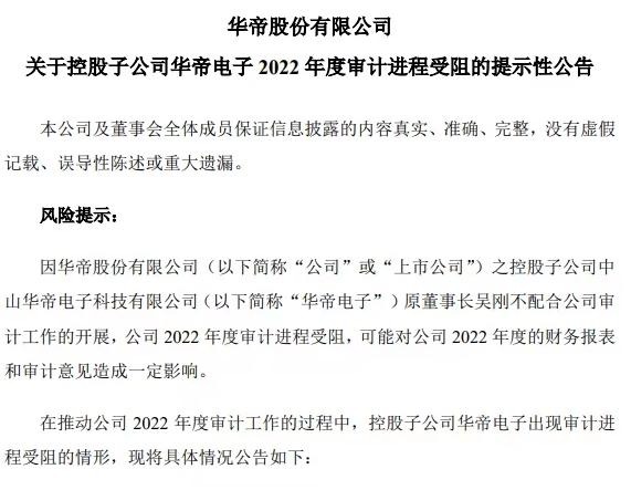 據悉,吳剛曾歷任華帝股份第一屆至第七屆董事會秘書,于2022年5月19日任期滿離任華帝股份常務副總裁、董事會秘書?,F在由于股東之間的合作基礎喪失,華帝股份試圖控制華帝電子的業務。這一系列事件導致公司審計工作受阻,可能對公司2022年度的財務報表和審計意見造成一定影響。目前,華帝股份方面表示正在準備回應。