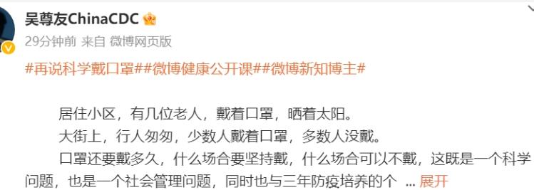 4月2日,中國疾控中心流行病學首席專家吳尊友在微博發文,就多個與口罩使用相關的問題進行了回應。