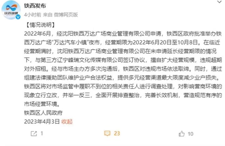 針對汽車小鎮夜市拆除一事,沈陽市鐵西區委宣傳部官方微博4月3日發布了一份情況說明,落款為鐵西區人民政府。根據該情況說明,2022年6月,沈陽鐵西萬達廣場商業管理有限公司申請舉辦鐵西萬達廣場“萬達汽車小鎮”夜市,經營期限為2022年6月20日至10月8日。在經營期限臨近時,沈陽鐵西萬達廣場商業管理有限公司未申請延長經營期限的情況下,與第三方遼寧峰瑞文化傳媒有限公司簽訂協議,擅自擴大經營規模,違規超期對外招租。