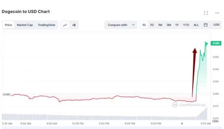 周一美股午盤時段,狗狗幣(DOGE)大幅上漲,一度從0.077美元漲至0.102美元,創下去年12月以來的盤中新高。在盤中,狗狗幣的漲幅一度達到30%,盡管后來略有收窄,但在美國股市收盤時,最近24小時漲幅仍超過了23%。