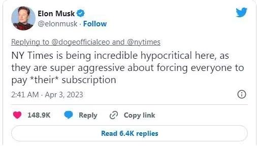 馬斯克在當天的推特上指責紐約時報虛偽,稱他們非常激進地強迫所有人為他們的訂閱內容付費,并表示該報在推特上發布的推文“稀爛”且沒有可讀性。他認為,如果他們只是發布自己的熱門文章,他們本可以比現在擁有更多的真實粉絲。