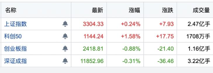 今日A股三大指數(shù)開盤漲跌不一,滬指一度站上3300點后震蕩回落,深成指和創(chuàng)業(yè)板指也逐漸下跌,其中創(chuàng)業(yè)板指跌幅超過1%。但科創(chuàng)50指數(shù)表現(xiàn)強勁,早盤漲幅超過1%。截止午間收盤,滬指漲0.24%,報3304.33點,深成指跌0.31%,報11852.96點,創(chuàng)業(yè)板指跌0.88%,報2418.81點,科創(chuàng)50指數(shù)漲1.58%,報1144.24點。