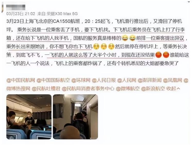 3月23日,多位乘客抱怨稱,乘坐國航CA1550航班時,因有一位乘客忘記帶手機,導(dǎo)致飛機滑行推出后返回,延誤了一個半小時。這一事件引起了機上乘客的不滿,包括一位要從北京轉(zhuǎn)機前往悉尼的大姐,她一度感到很著急。