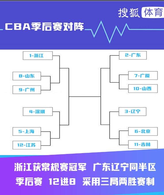季后賽首輪的對(duì)陣分別是山東VS廣州、上海VS江蘇、廣廈VS山西、北京VS吉林。常規(guī)賽冠軍浙江隊(duì)將在8進(jìn)4的比賽中對(duì)陣山東和廣州之間的勝者,而同區(qū)的深圳隊(duì)將對(duì)陣上海和江蘇之間的勝者。獲得常規(guī)賽第三名的衛(wèi)冕冠軍遼寧男籃與廣東同區(qū),遼寧將在8進(jìn)4的比賽中對(duì)陣北京和吉林之間的勝者,而廣東男籃將對(duì)著廣廈和山西之間的勝者。