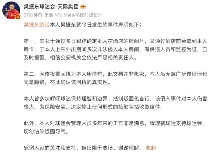 近日,乒乓球選手樊振東通過其球迷會的微博賬號發布聲明,回應其房間被非法侵入一事。