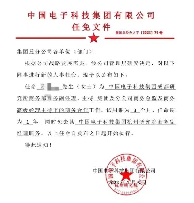 但是,記者從中國(guó)電科成都多家單位獲悉,這些信息都是虛假的。集團(tuán)公司已經(jīng)開(kāi)展了多輪次排查,包括勞務(wù)派遣和協(xié)作人員,均未找到該陳某人。此外,網(wǎng)上出現(xiàn)的任免文件明顯是偽造的。相關(guān)單位已報(bào)案。
